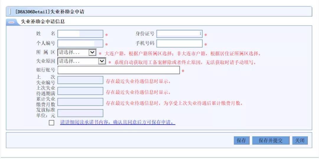 步驟四:點(diǎn)擊失業(yè)補(bǔ)助金申請(qǐng)模塊,系統(tǒng)自動(dòng)獲取社會(huì)保障卡號(hào),錄入個(gè)人基本信息(填報(bào)信息里帶*號(hào)的必填,不帶*號(hào)的不用填),簽訂申領(lǐng)失業(yè)補(bǔ)助金承諾書,在確認(rèn)無誤后按保存并提交 鈕上傳申領(lǐng)數(shù)據(jù)。如持有承載失業(yè)保險(xiǎn)待遇發(fā)放的八家銀行(工商銀行、農(nóng)業(yè)銀行、中國銀行、建設(shè)銀行、交通銀行、大連銀行、郵政儲(chǔ)蓄銀行、農(nóng)商銀行)的社會(huì)保障卡,需先到社保卡發(fā)卡銀行開通社?ń鹑诠δ(開通后五個(gè)工作日后再申請(qǐng))確保正常領(lǐng)取失業(yè)補(bǔ)助金待遇。如持有其他銀行的社?▌t需錄入大連銀行卡號(hào)申領(lǐng)。